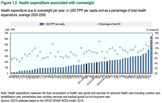 CDC(美国疾病控制和预防中心)2017-2018年度健康调查结果显示,42%的美国成年人“肥胖”,超过9%的美国成年人“严重肥胖”。OECD于2019发布的一篇名为The Heavy Burden of Obesity的研究报告对全球各国肥胖症治疗费用医疗支出所占比例进行预测,美国以14%稳居首位。